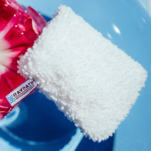 - Przed użyciem Face Glove, dokładnie zwilż ją wodą. Upewnij się, że jest odpowiednio nawilżona, ale nie przemoczona.